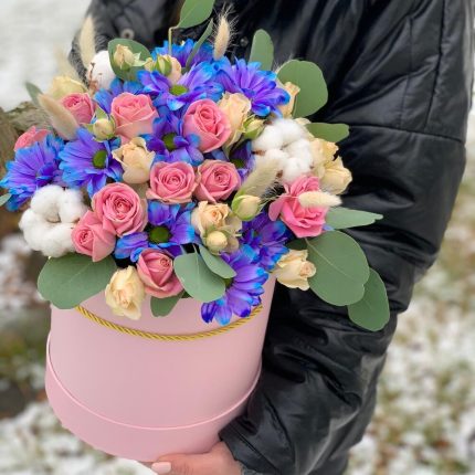 Яркая композиция из французских роз Найтингейл, хризантемы Момоко, ароматных нарциссов и маттиолы с эвкалиптом в коробке