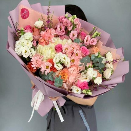 Большой букет с французскими розами, пион кустовой розой и гортензией