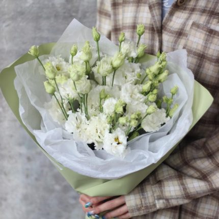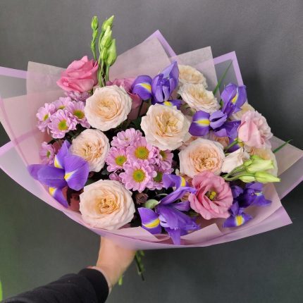 Яркий комплимент: яркие цветы в сумочке (лизиантус, красная роза, пионовидная кустовая роза”