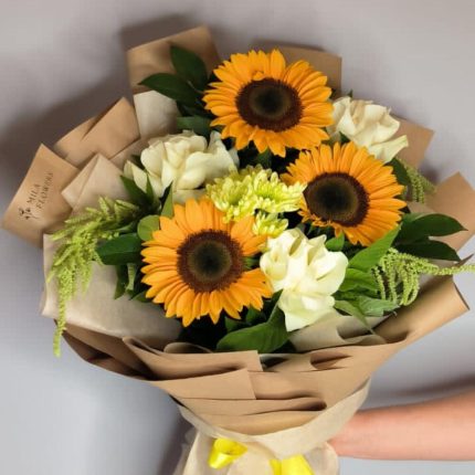 Букет-комплимент с подсолнухом, колосьями ( триникум), альстромерией , солидагой и зеленью