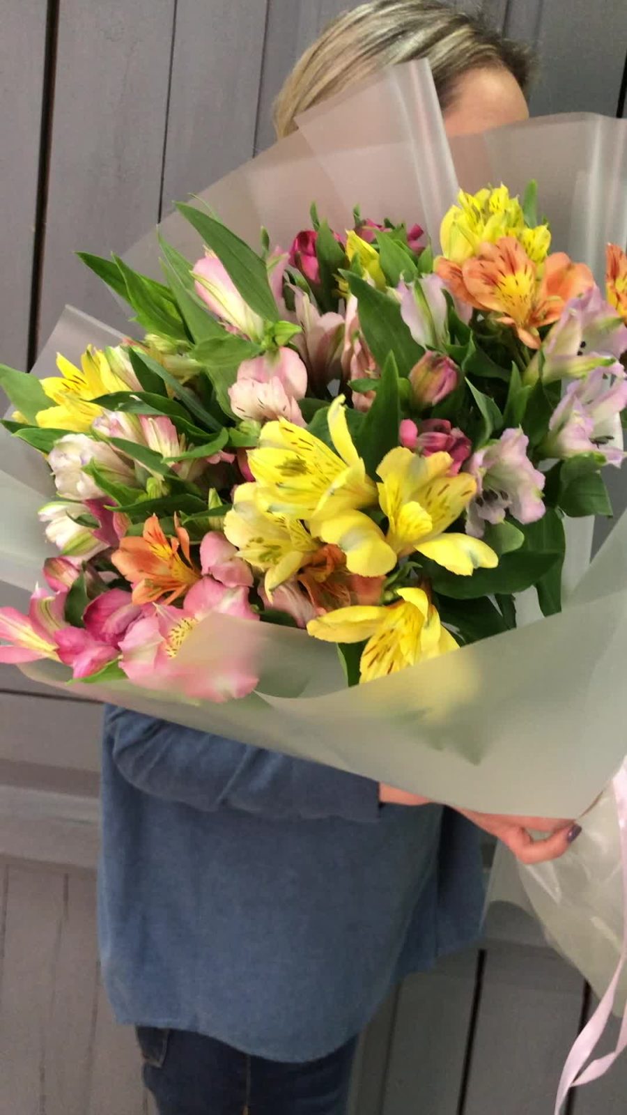Альстромерия – 15 шт.Упаковка дизайнерская – 4 шт.Лента атласная – 2 шт.