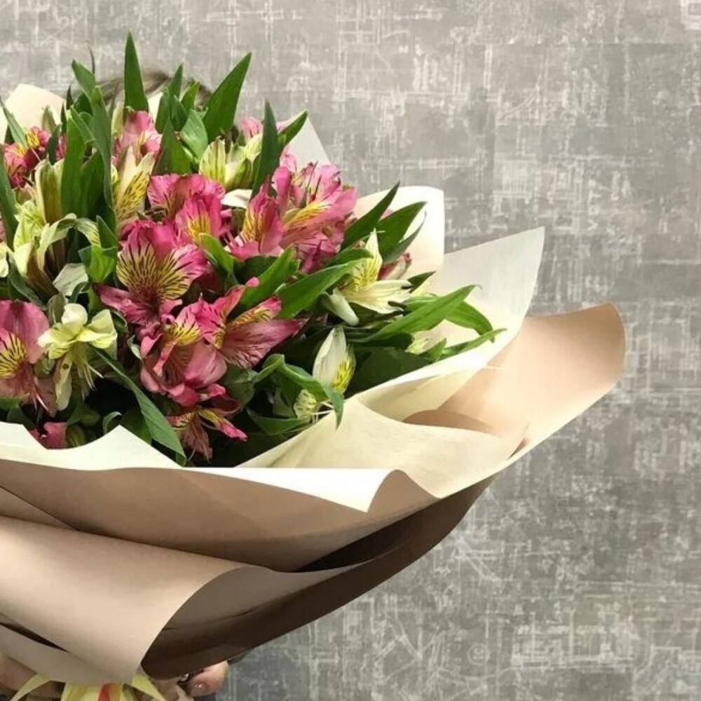 Альстромерия – 21 шт.Упаковка дизайнерская – 4 шт.Лента атласная – 2 шт.