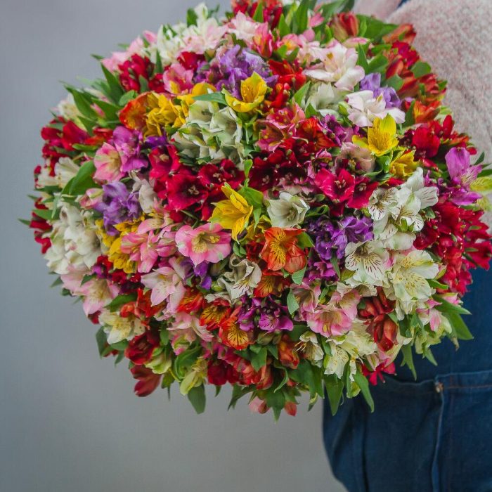 Альстромерия белая – 21 шт.Альстромерия розовая – 20 шт.Альстромерия красная – 20 шт.Альстромерия желтая – 20 шт.Альстромерия сиреневая – 20 шт.Атласная лента – 1 шт.