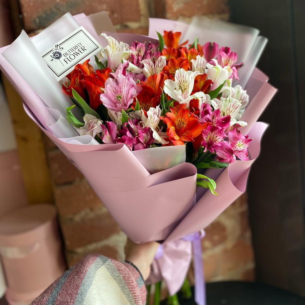 Альстромерия – 15 шт.Лента атласная – 1 шт.Упаковка дизайнерская – 1 шт.