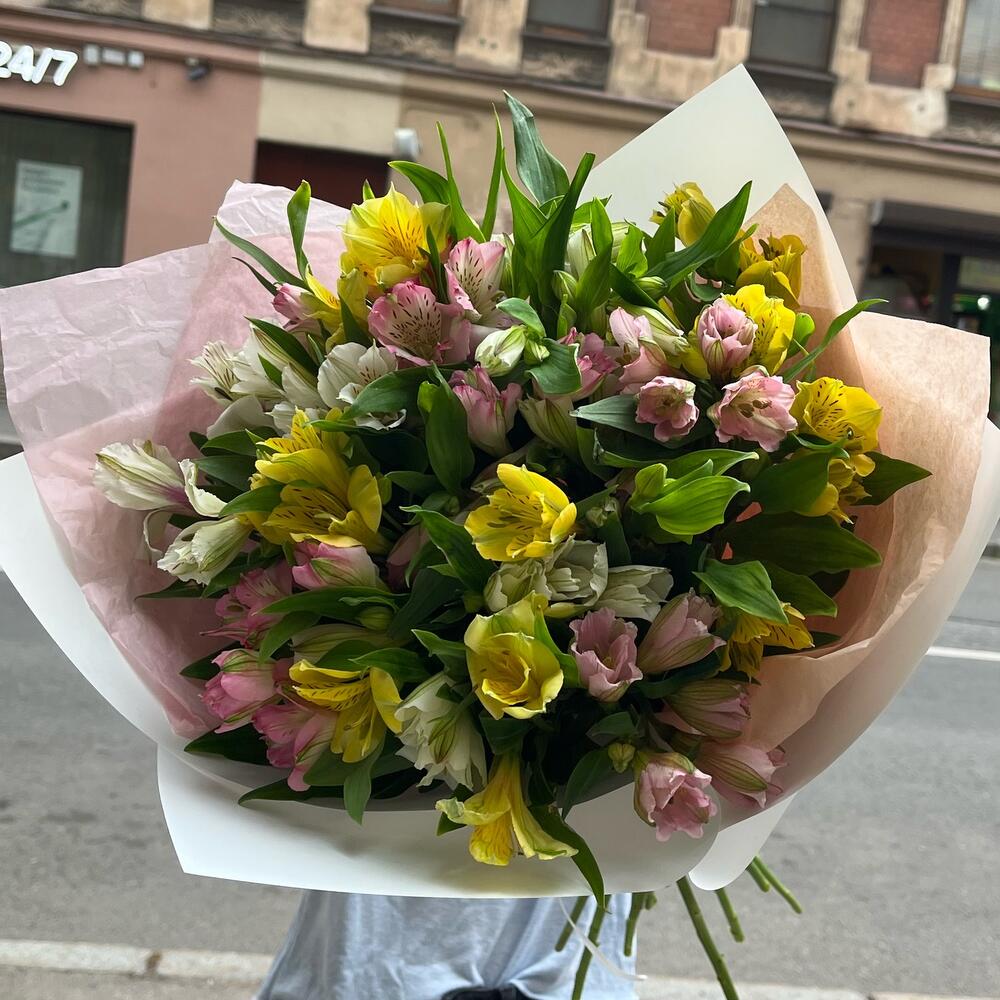 Альстромерия желтая – 5 шт.Альстромерия белая – 5 шт.Альстромерия розовая – 5 шт.Упаковка тишью – 1 шт.упаковка пленка белая – 2 шт.Открыточка с вашими пожеланиями – 1 шт.