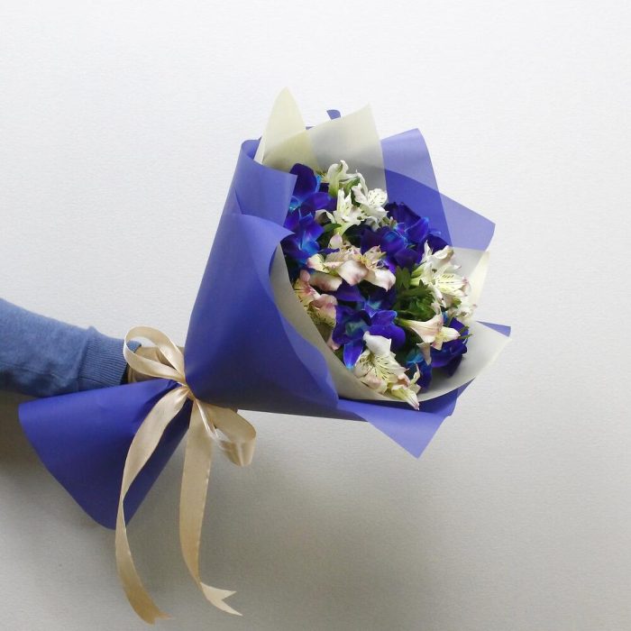 Альстромерия – 5 шт.Рускус – 6 шт.Лента атласная – 1 шт.удлинитель для орхидеи – 6 шт.Средство для продления жизни цветов – 1 шт.Дизайнерская упаковка – 2 шт.инструкция по уходу за цветами – 1 шт.любовь флориста (бесплатно) – 1 шт.орхидея дендробиум синяя цветочки – 12 шт.