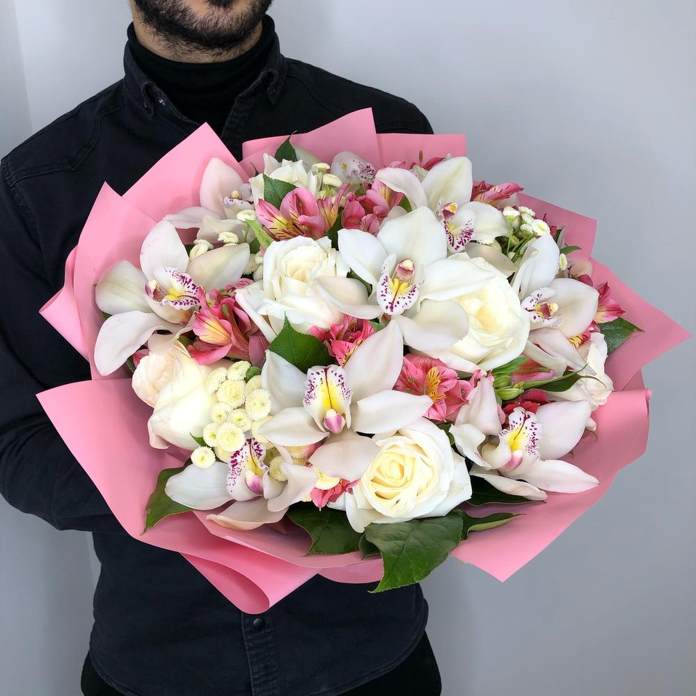 Орхидея Цимбидиум – 15 шт.Альстромерия – 16 шт.Упаковка – 1 шт.зелень декоративная – 15 шт.