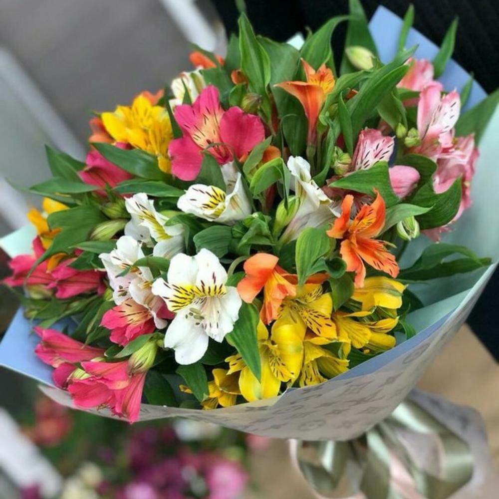 Альстромерия – 15 шт.Упаковка дизайнерская – 1 шт.Лента атласная – 1 шт.