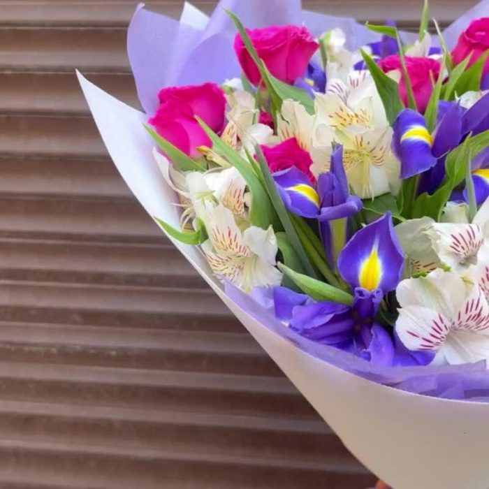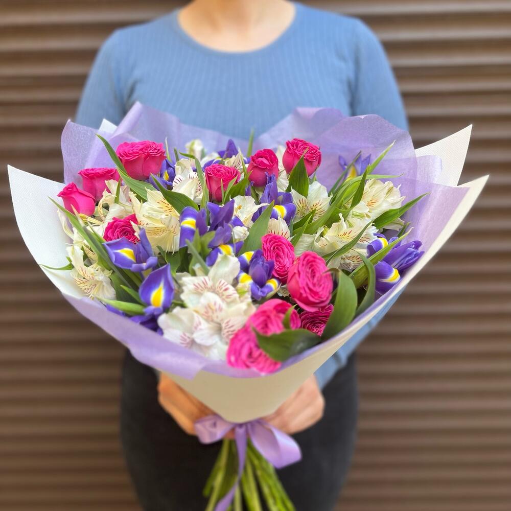 Альстромерия – 7 шт.Ирис – 10 шт.Зелень – 5 шт.Тишью – 2 шт.Пленка дизайнерская – 2 шт.классик сенсейшен – 3 шт.