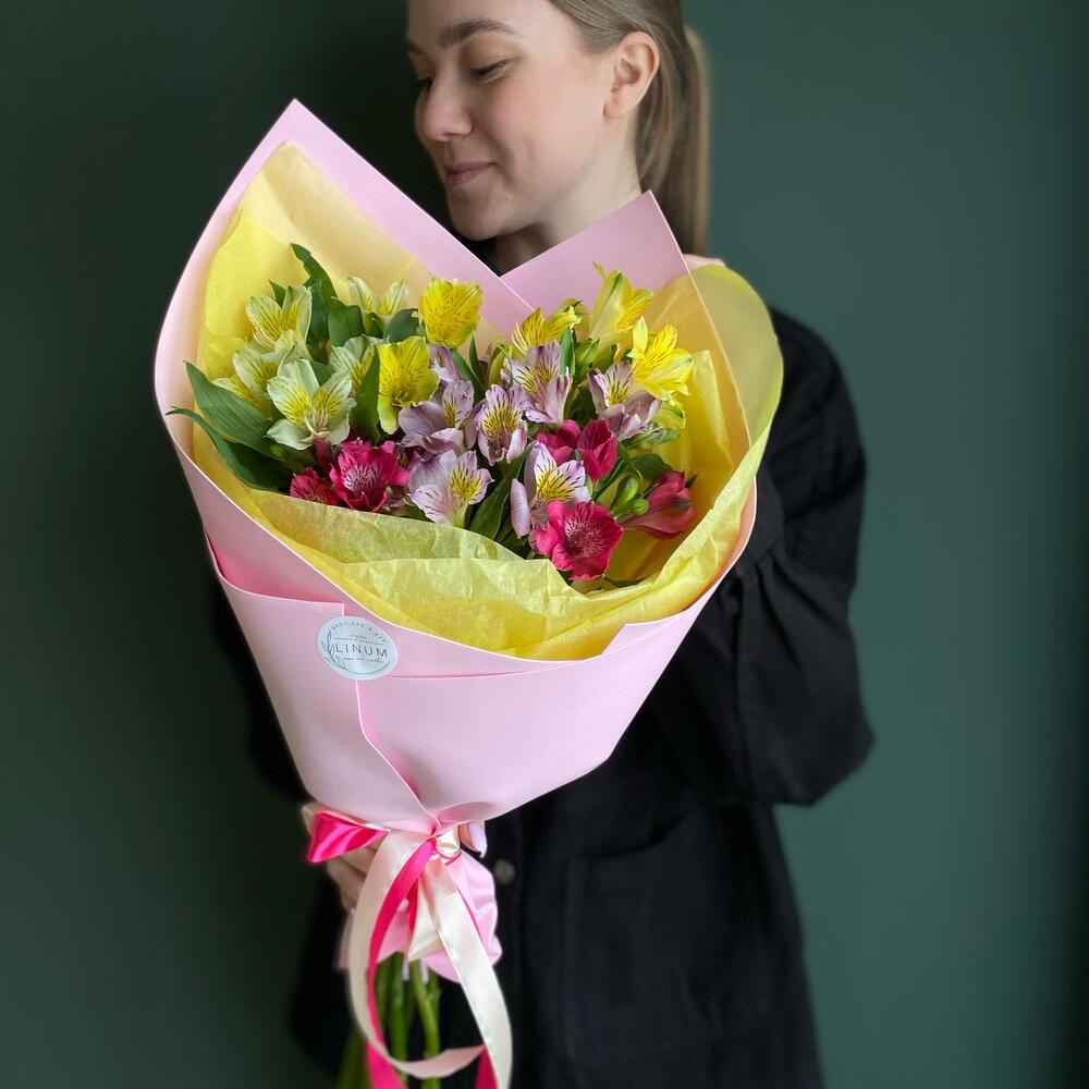 Яркий , вызывающий улыбку , моно букет с альстромерией – приятные комплимент коллеге или любимой