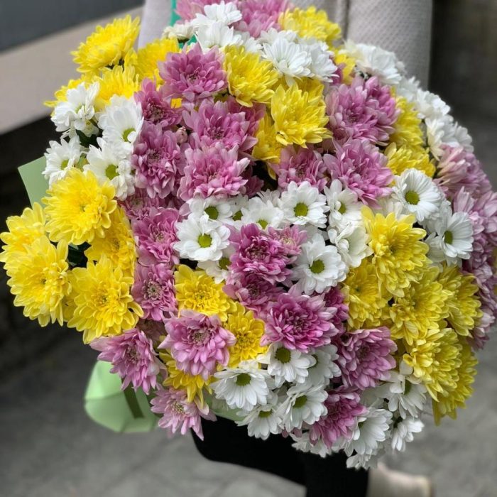 Прекрасный, большой букет из разноцветных хризантем в стильном оформлении.