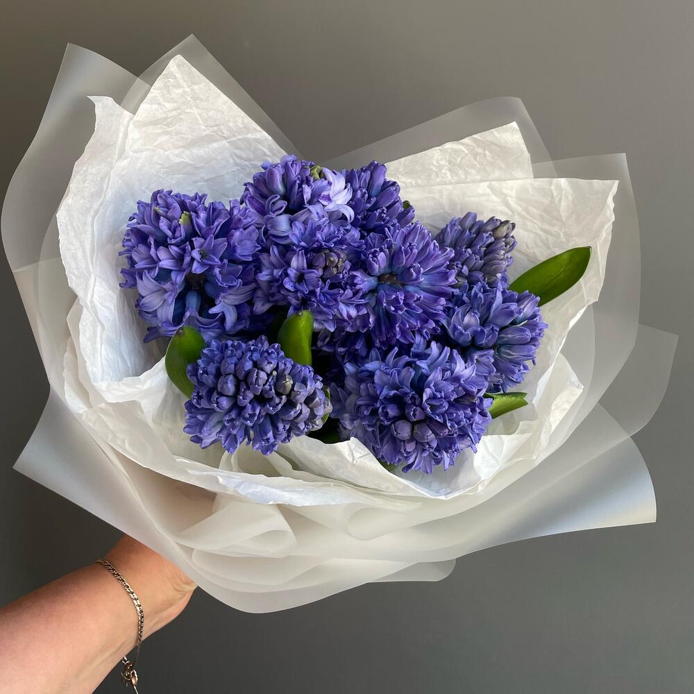 Гиацинт – 9 шт.Лента атласная – 2 шт.Тишью – 4 шт.Упаковка дизайнерская – 2 шт.