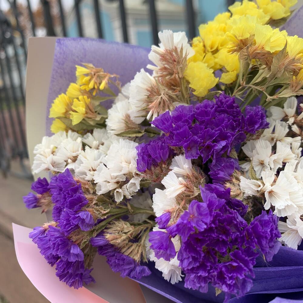 «Лавандовое созвездие» Букет из розы, гвоздики, статица и хлопка