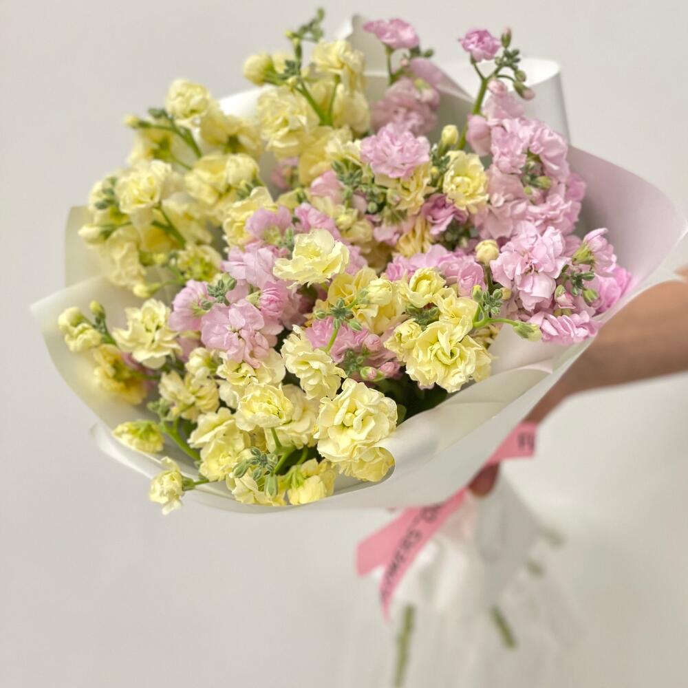 Авторский букет с сортовыми розами, ароматной маттиолой и лизиантус «Чудеса»