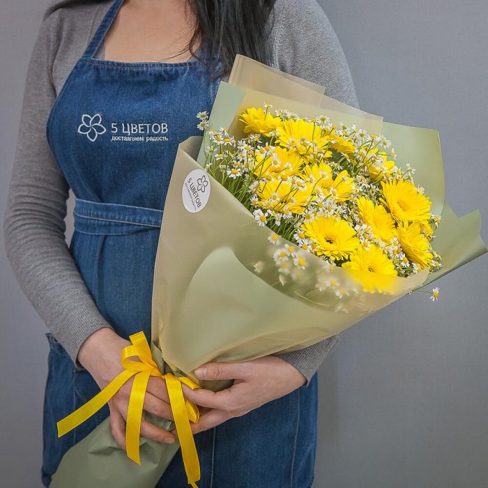 Букет из 15 желтых гербер и 20 ромашек кустовых