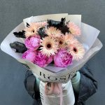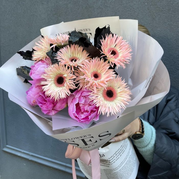 гербера рожева – 8 шт. півонія – 4 шт. листя фарбоване – 2 шт.