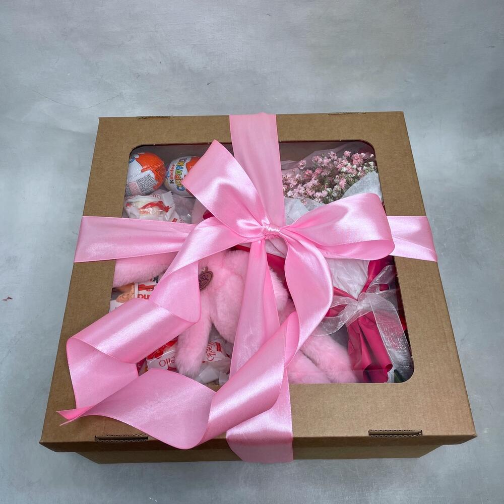Гипсофила – 3 шт.Упаковка – 1 шт.Kinder bueno – 1 шт.Kinder сюрприз – 2 шт.Kinder chocolate – 1 шт.Raffaello конфеты – 10 шт.коробка крафт с окошком – 1 шт.
