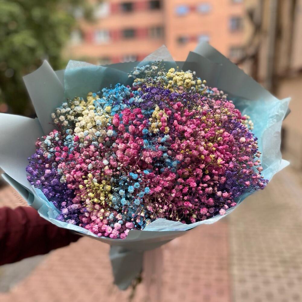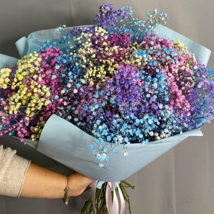 гипсофила радужная окрашенная – 11 шт.Дизайнерская упаковка – 2 шт.Лента атласная – 1 шт.