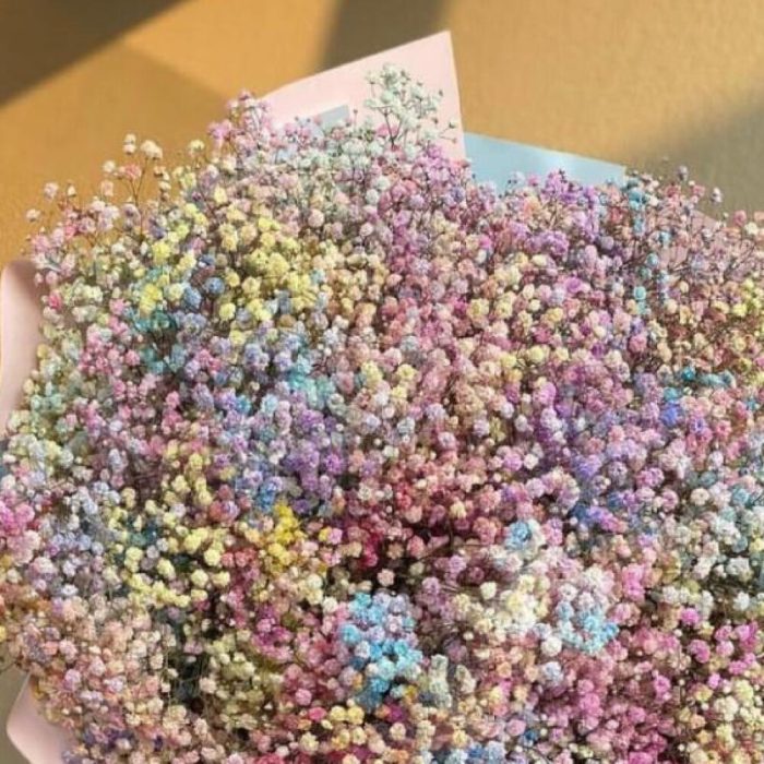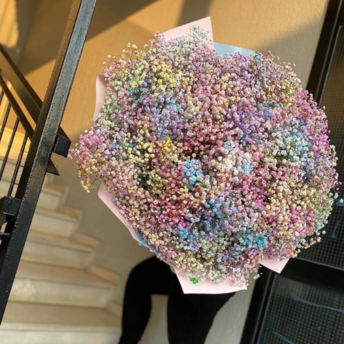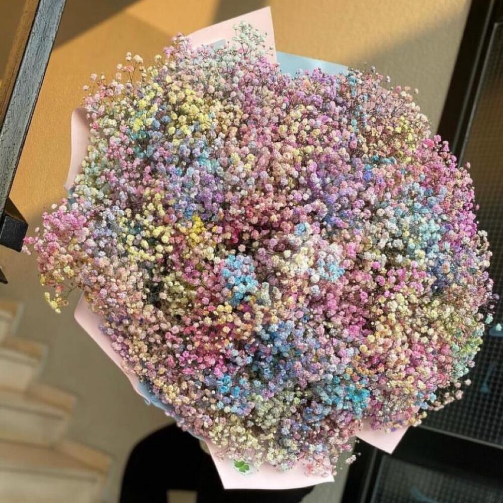 гипсофила радужная – 51 шт.Упаковка дизайнерская – 1 шт.Лента атласная – 2 шт.Открыточка с вашими пожеланиями – 1 шт.хорошее настроение – 100 шт.инструкция по уходу за цветами – 1 шт.коробка переноска – 1 шт.Кризал – 1 шт.
