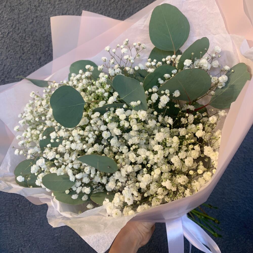 Гипсофила – 7 шт.Эвкалипт – 5 шт.Лента атласная – 1 шт.Пленка матовая – 2 шт.Бумага тишью – 2 шт.