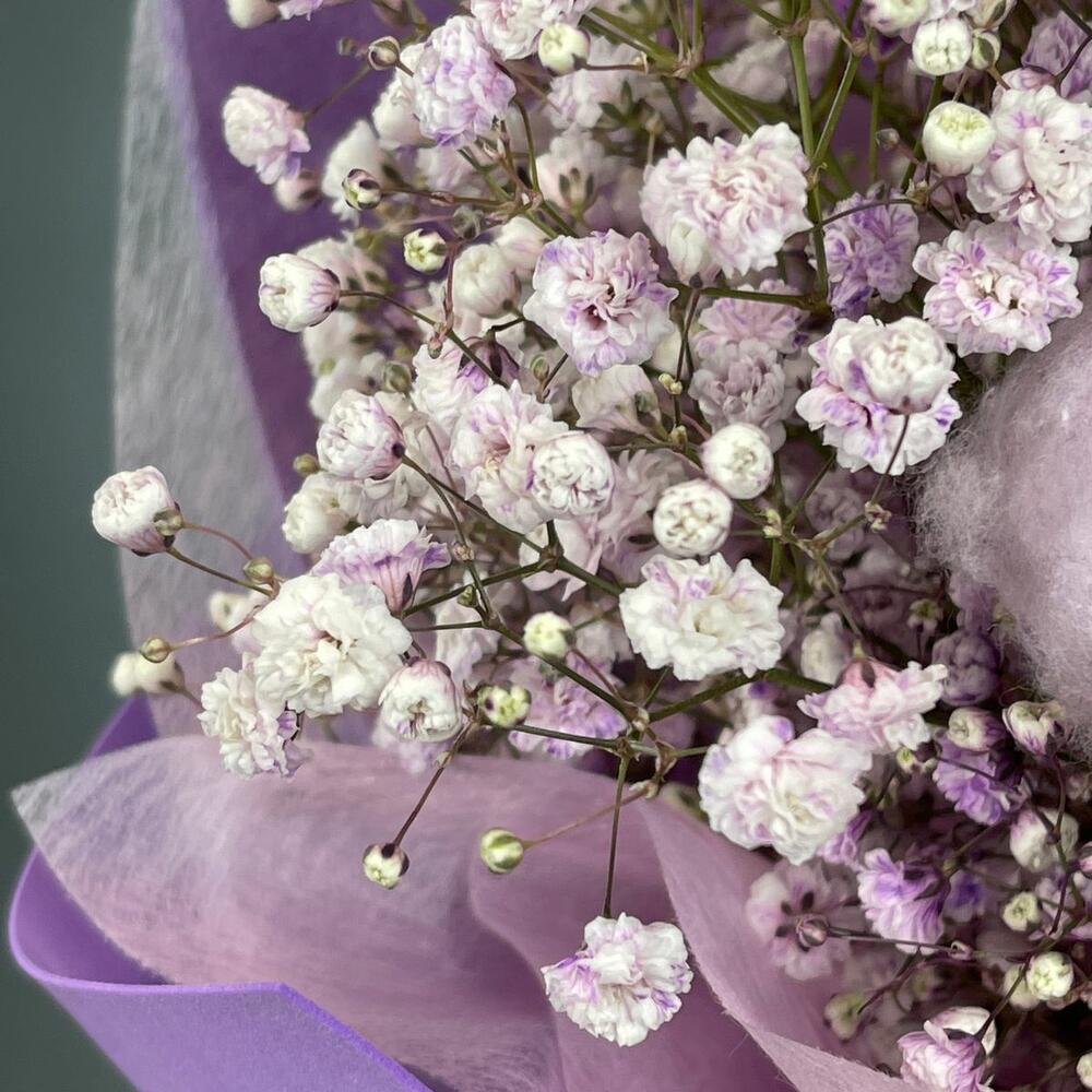 Гипсофила – 3 шт.Хлопок – 1 шт.Лента атласная – 1 шт.Упаковка дизайнерская – 2 шт.
