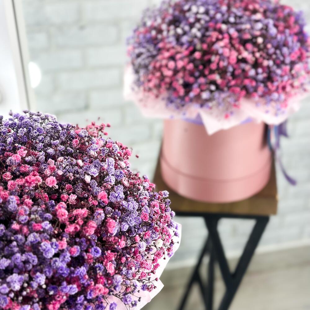 “Сиреневый туман” – композиция из гипсофилы в шляпной коробке