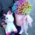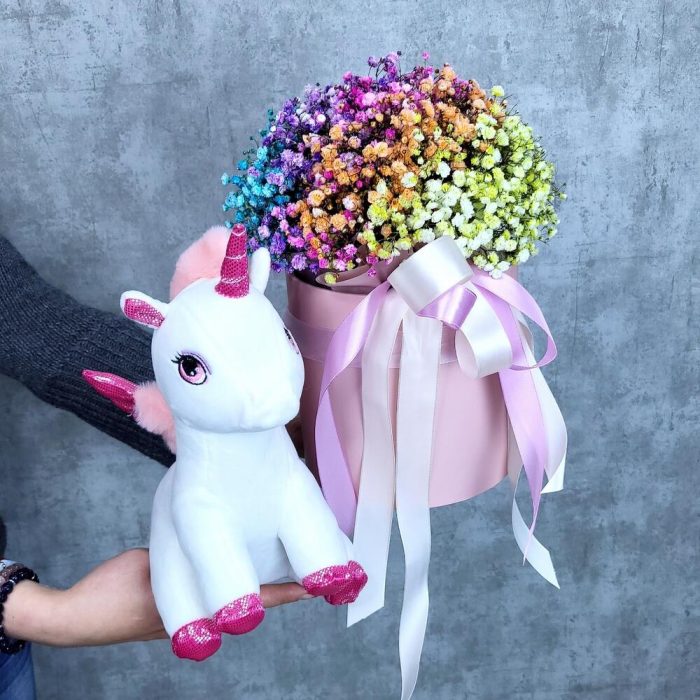 Единорог Евграф и коробочка с радужной гипсофилой