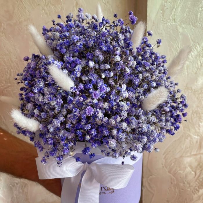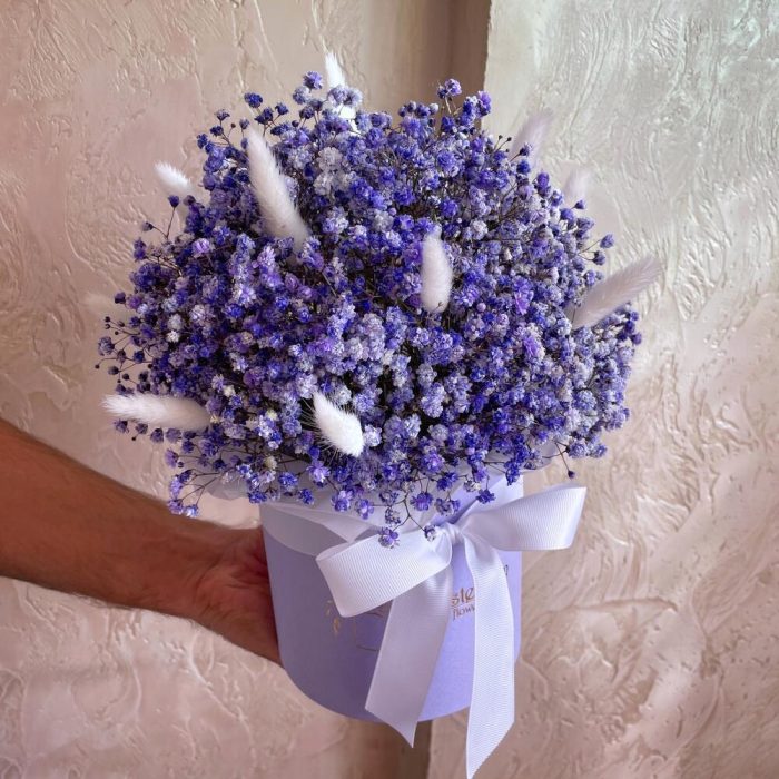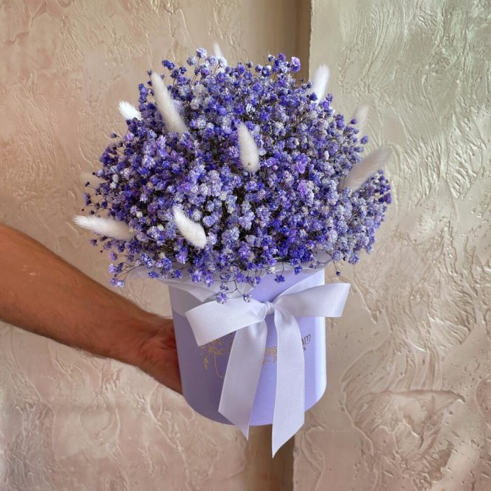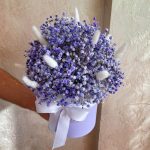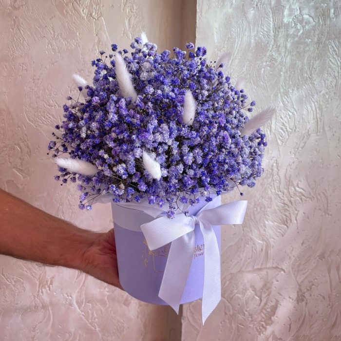 “Сиреневый туман” – композиция из гипсофилы в шляпной коробке