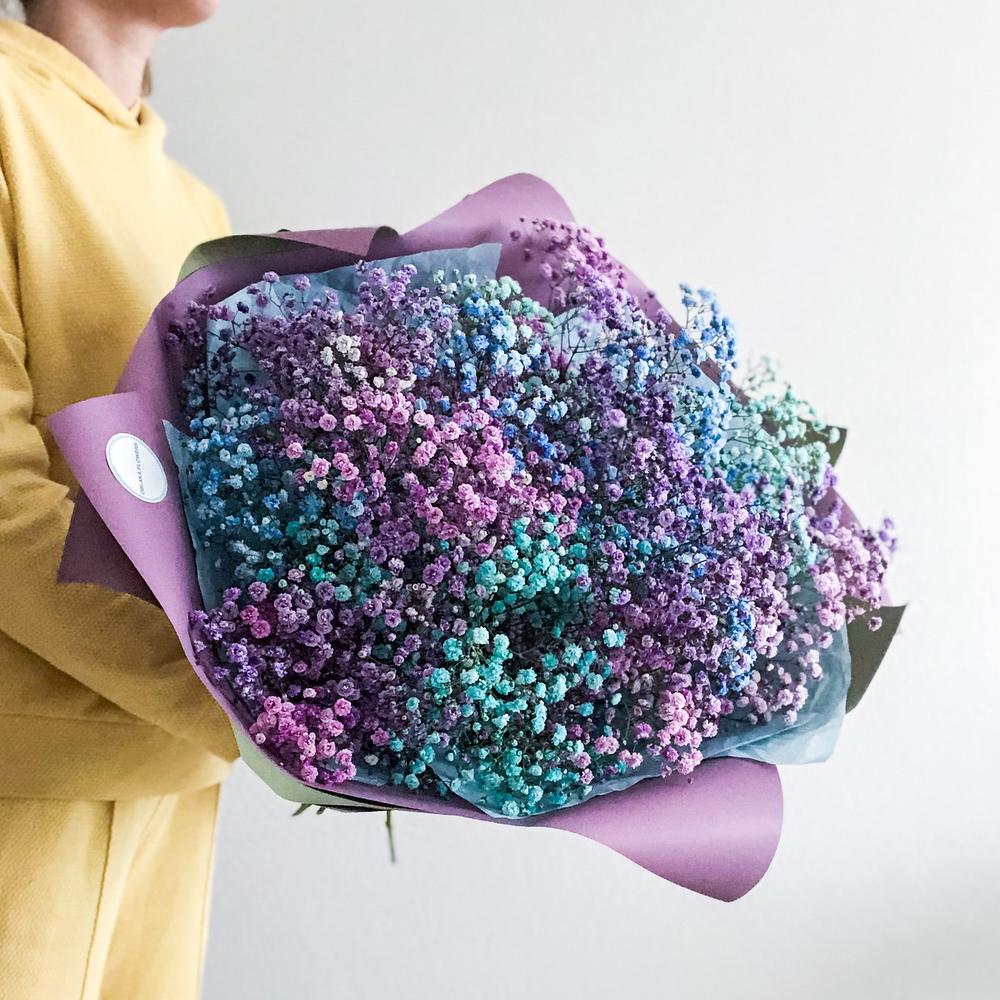 гипсофила цветная – 11 шт.Упаковка корейская пленка – 2 шт.Тишью – 2 шт.Лента атласная – 1 шт.Упаковка транспортировочная пленка – 1 шт.инструкция по уходу за цветами – 1 шт.