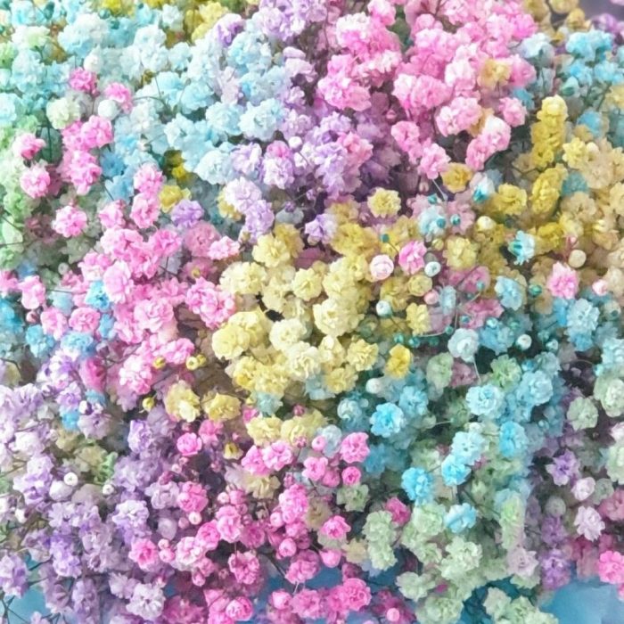 Лента атласная – 1 шт.Коробка шляпная – 1 шт.Открыточка с вашими пожеланиями – 1 шт.Оазис флористический – 1 шт.гипсофила радужная – 7 шт.