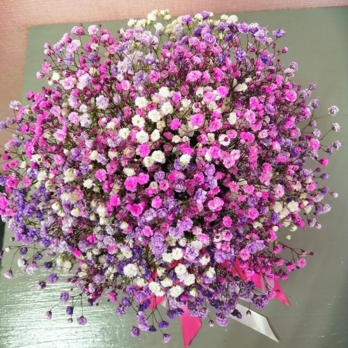 “Сиреневый туман” – композиция из гипсофилы в шляпной коробке