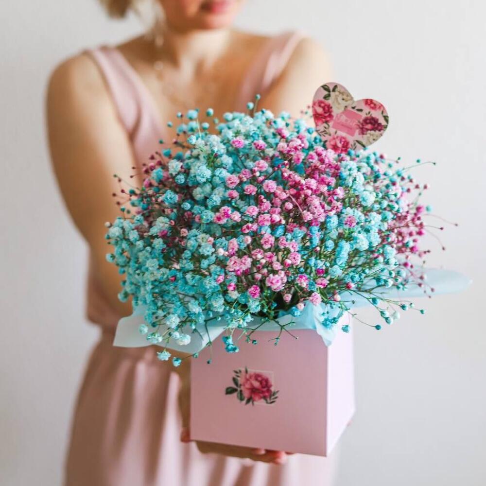 гипсофила цветная – 5 шт.Коробка квадратная – 1 шт.Топпер – 1 шт.Оазис флористический – 1 шт.Тишью – 4 шт.коробка транспортировочная – 1 шт.