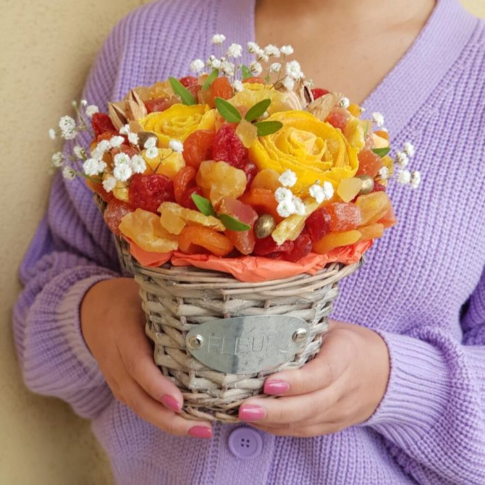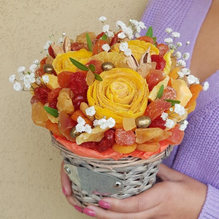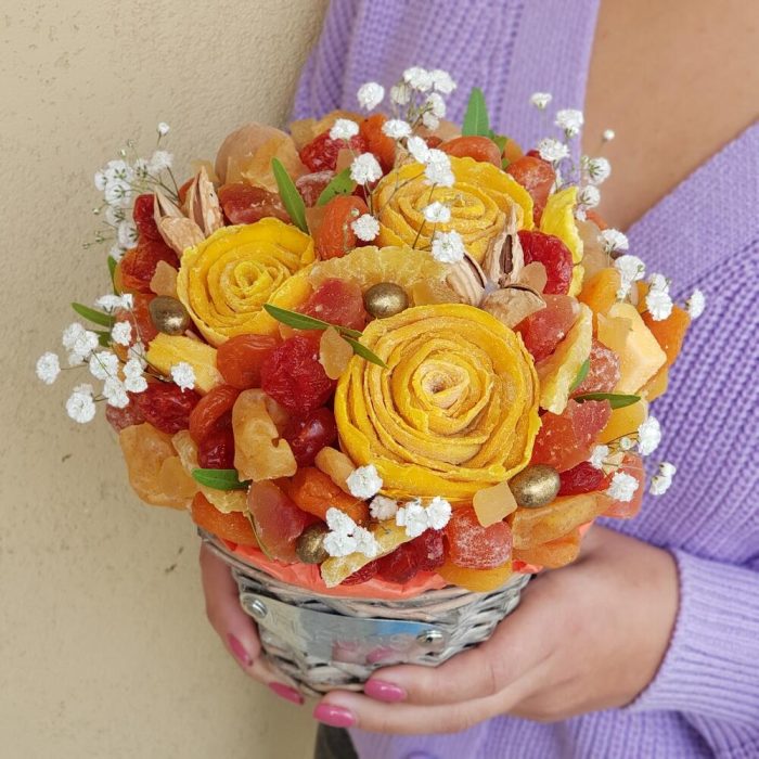 Гипсофила – 1 шт.Грецкий орех – 45 гр.Груша – 70 гр.манго – 148 гр.Папайя – 70 гр.Вишня – 25 гр.Курага – 152 гр.кизил – 68 гр.ананас кубики – 20 гр.миндаль в скорлупе – 15 гр.ананас вяленый – 55 гр.манговые конфеты – 3 шт.арахис в перламутре – 10 гр.кумкват в сахарной пудре – 60 гр.