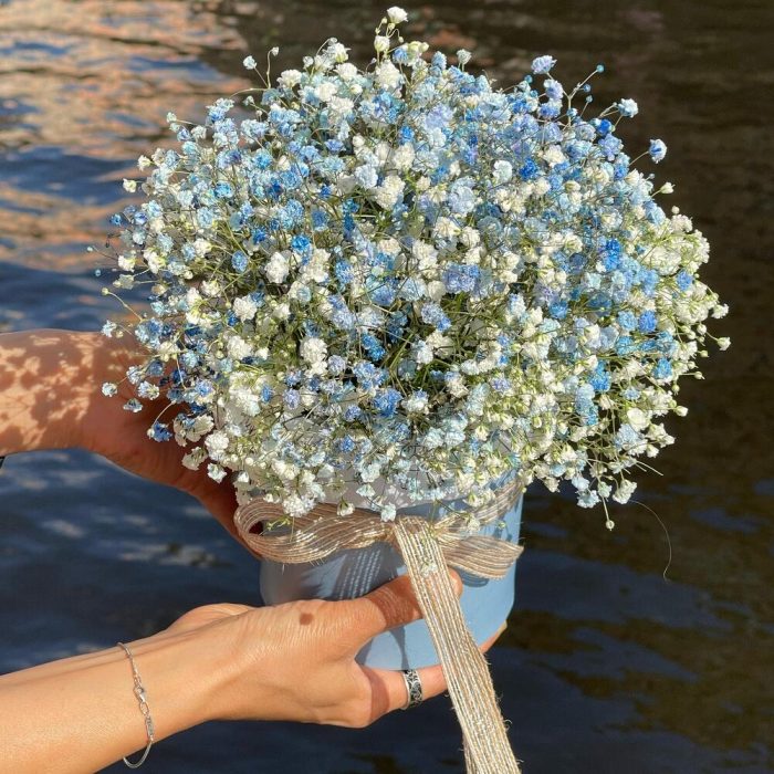 Тишью – 1 шт.Лента атласная – 1 шт.Оазис флористический – 1 шт.Коробка шляпная – 1 шт.Гипсофила – 6 шт.