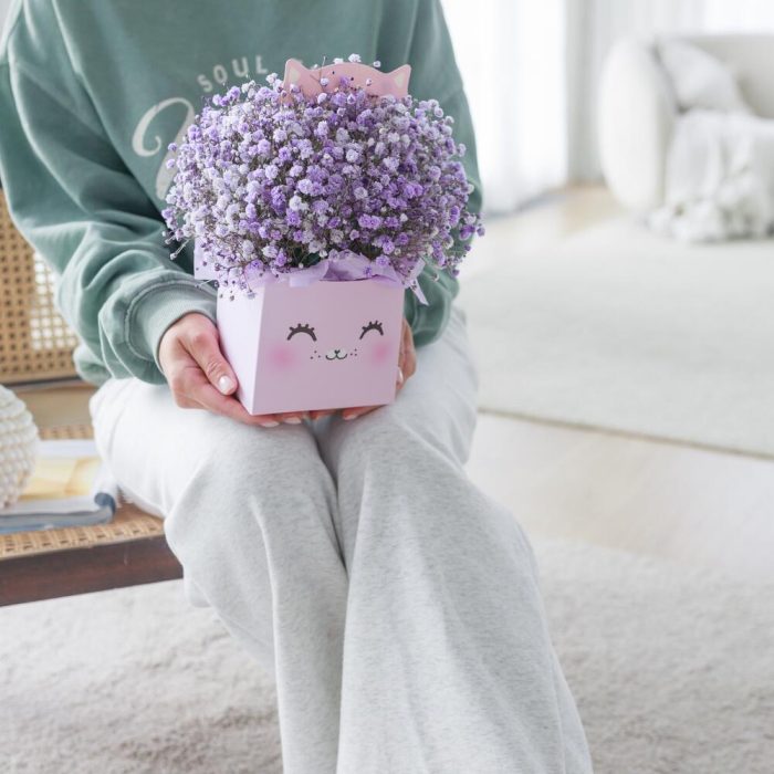 Тишью – 4 шт.Оазис флористический – 1 шт.коробка транспортировочная – 1 шт.коробка котик – 1 шт.гипсофила цветная – 5 шт.