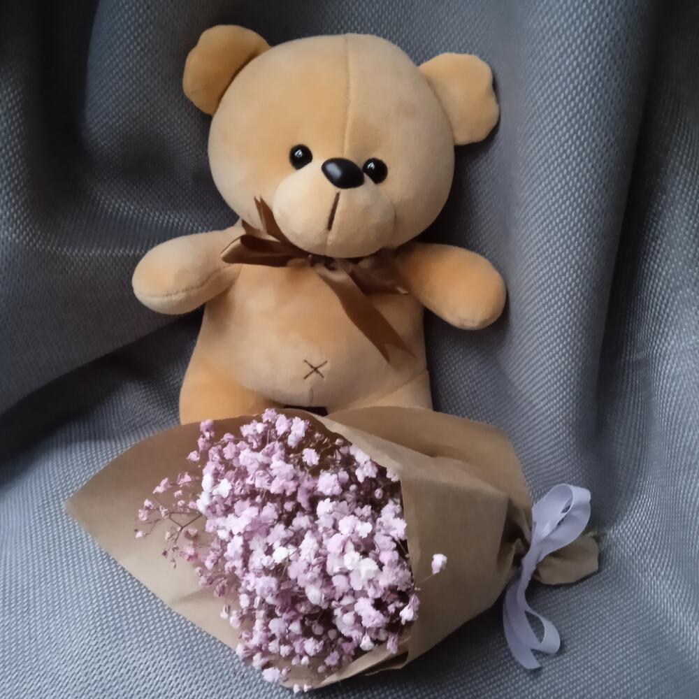 Гипсофила – 5 шт.Лента атласная – 1 шт.Крафт упаковка – 1 шт.Мишка плюшевый – 1 шт.