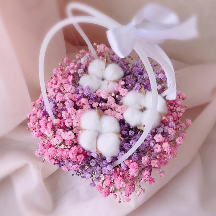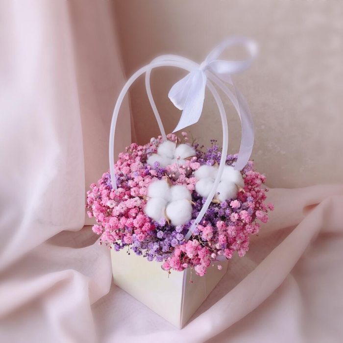 Хлопок – 3 шт.Лента атласная – 1 шт.Сумочка – 1 шт.Флористическая губка (оазис) – 1 шт.радужная гипсофила – 3 шт.