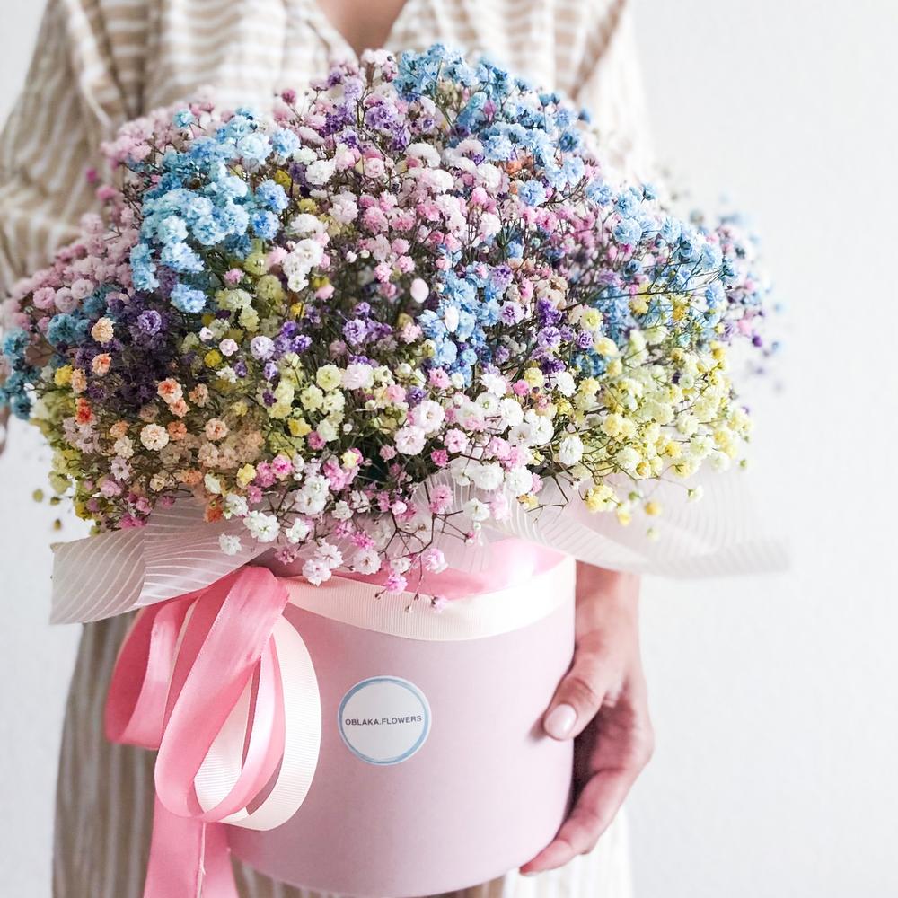 Очаровательная, воздушная композиция из гипсофилы, в шляпной коробке.Цветы стоят в специальной флористической губке,что позволяет им больше оставаться свежими и радовать получателя. Так же композиция в коробке это очень удобно и эффектно, так как не надо ставить букет в вазу и менять воду. Необходимо лишь подливать в губку воду.Инструкция по уходу за цветами прикреплена к каждому заказу.Цветы гипсофилы отличаются стойкостью и даже при высыхании не теряют, декоративности и цвета. Что позволяет, долгое время украшать интерьер в качестве сухоцветов.Подпишем открытку с вашими пожеланиями бесплатно