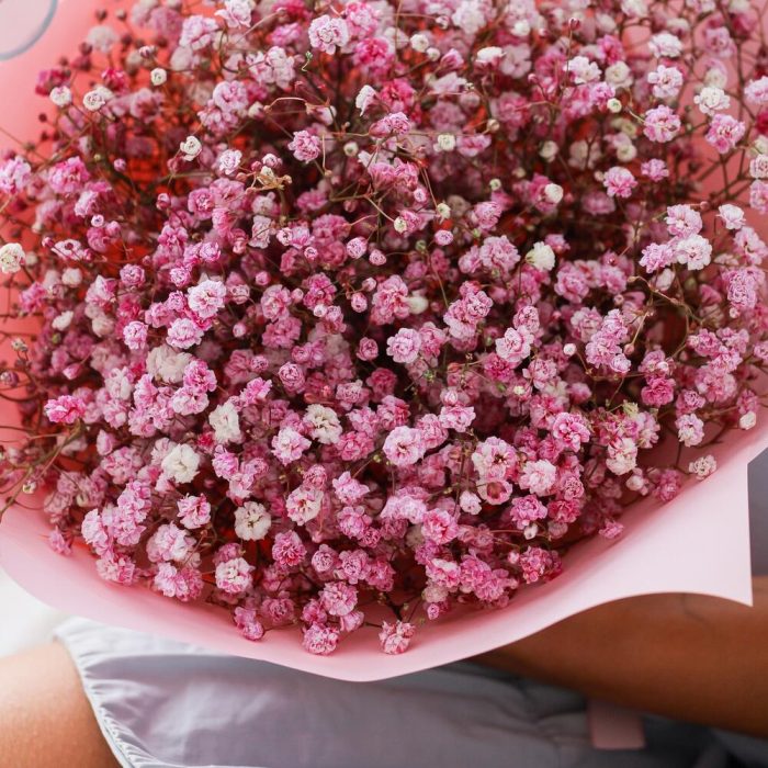 гипсофила цветная – 5 шт.Пленка корейская – 2 шт.Лента атласная – 1 шт.