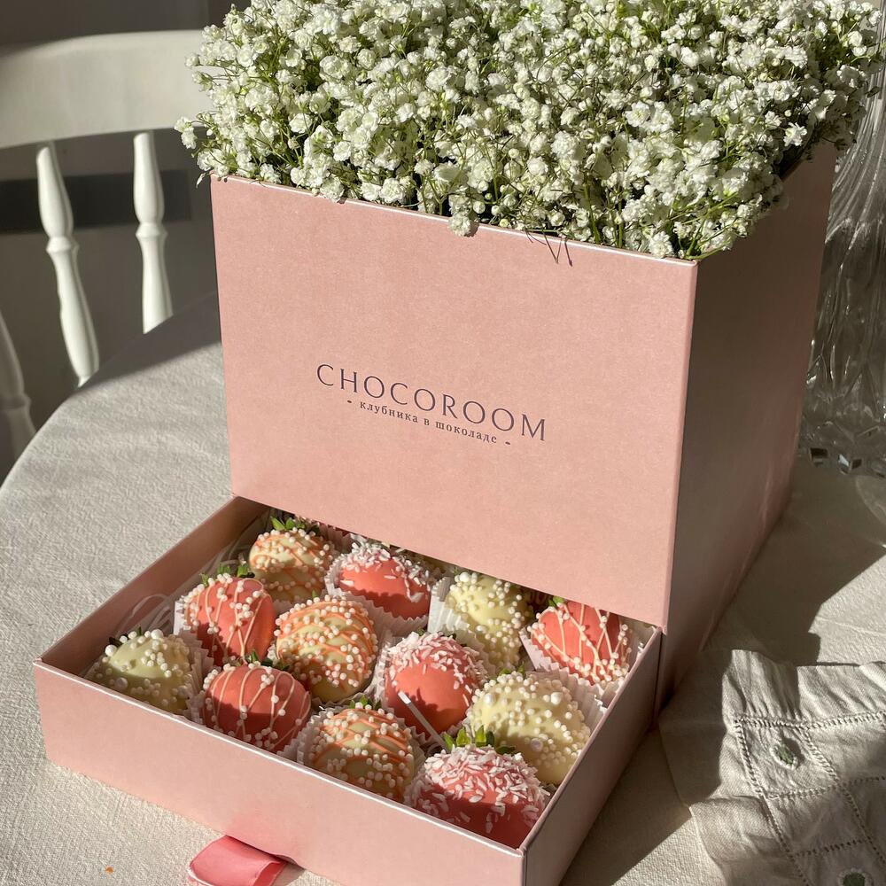 Шкатулка «Пинк» с клубникой в шоколаде и гипсофилой - 16 ягод и 7 гипсофил