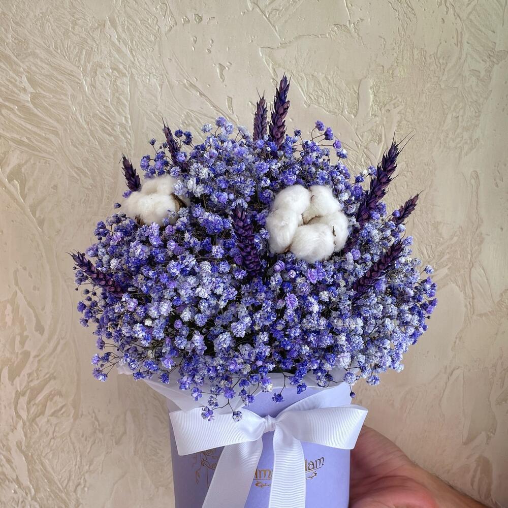 Гипсофила – 7 шт. Хлопок – 3 шт. Коробка шляпная – 1 шт. Пшеница – 11 шт. Оазис флористический – 1 шт.