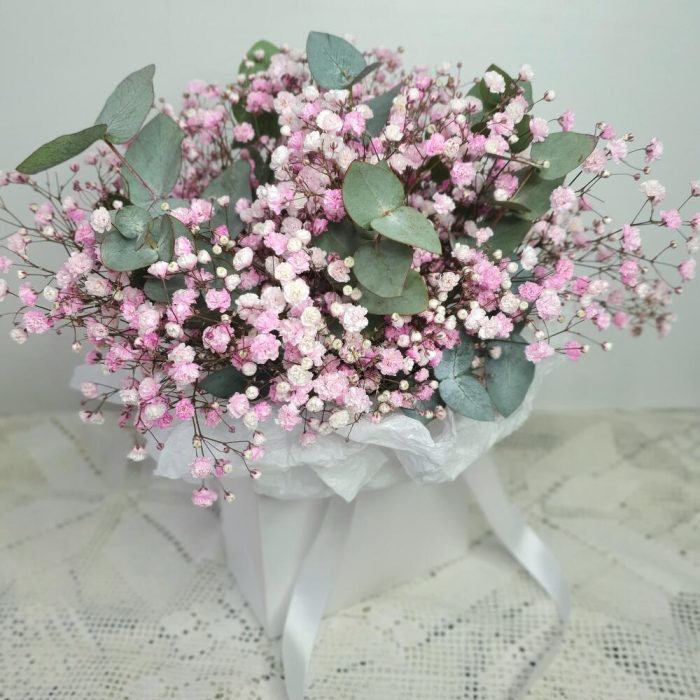Гипсофила – 5 шт.Эвкалипт – 6 шт.сумочка картонная с лентами – 1 шт.Тишью – 1 шт.Губка флористическая – 1 шт.