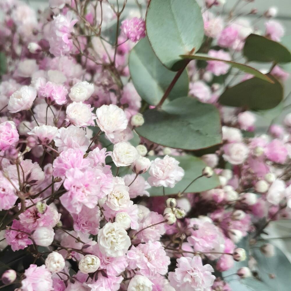 Нежная композиция в сумочке из воздушной гибсофилы с добавлением эвкалипта)))Станет прекрасным подарком)))
