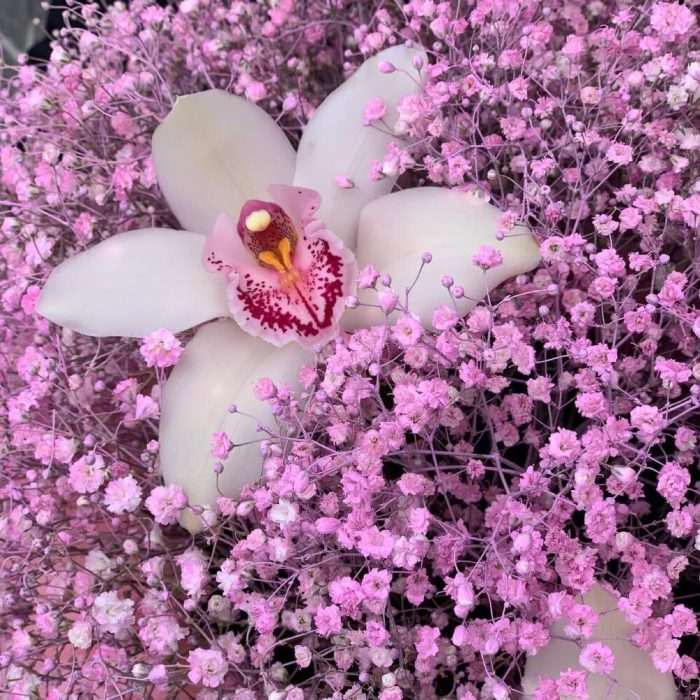 Гипсофила – 10 шт.Орхидея Цимбидиум – 3 шт.Коробка шляпная – 1 шт.Оазис флористический – 2 шт.Пленка матовая – 1 шт.Тишью – 3 шт.Лента атласная – 4 шт.