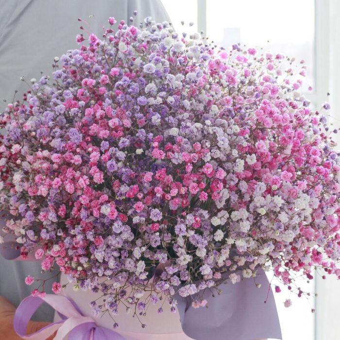 гипсофила цветная – 9 шт.Коробка шляпная – 1 шт.Лента атласная – 2 шт.упаковка пленка корейская – 1 шт.Флористическая губка – 3 шт.