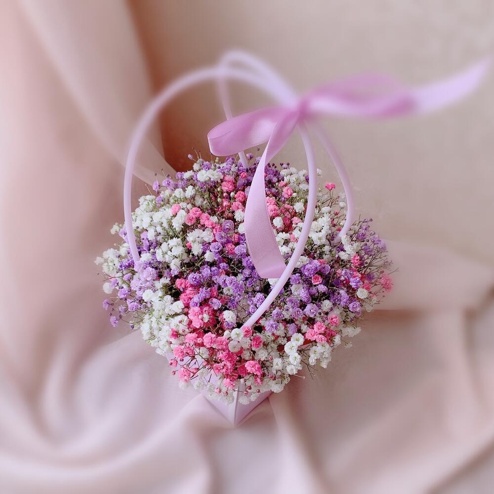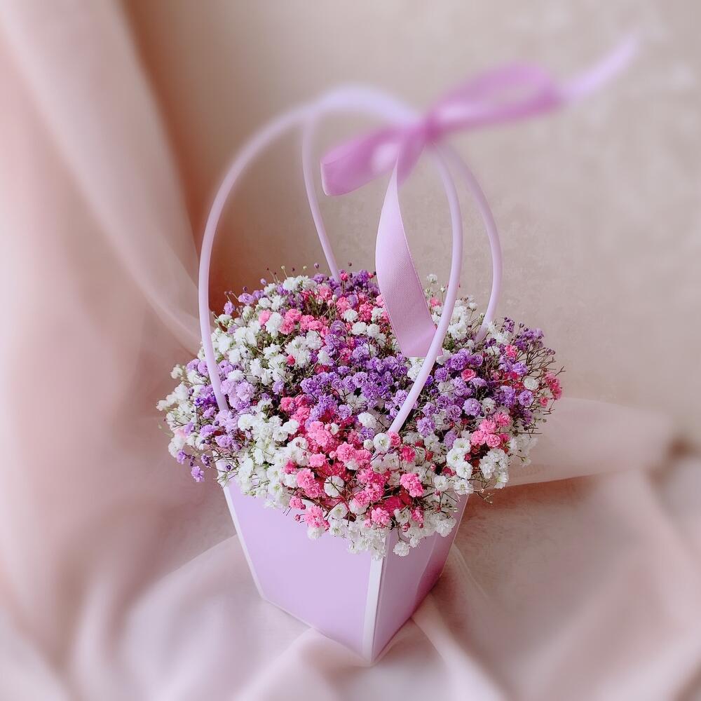 Цветы в коробке розы и гипсофилы