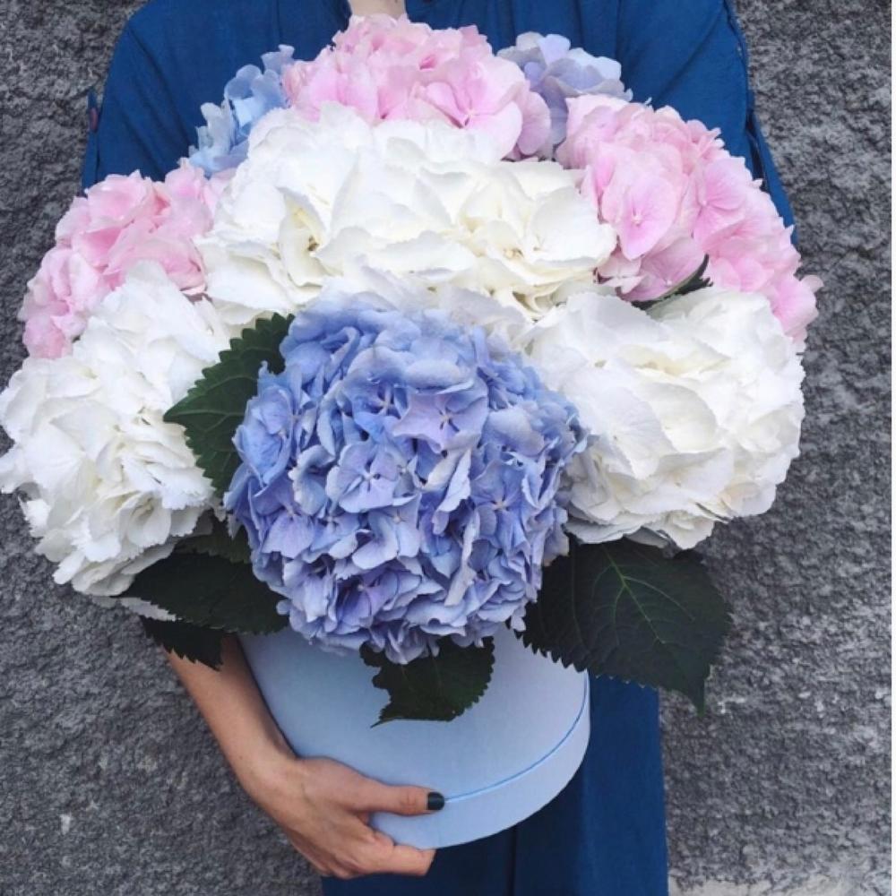 Букет из 9 гортензий микс в шляпной коробке