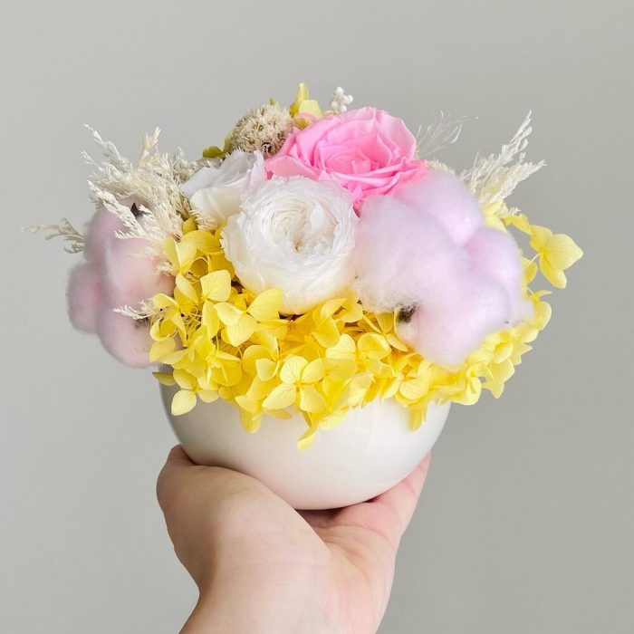 Гортензия – 3 шт.Хлопок – 3 шт.лимониум стабилизированный – 8 шт.розы стабилизированные – 3 шт.
