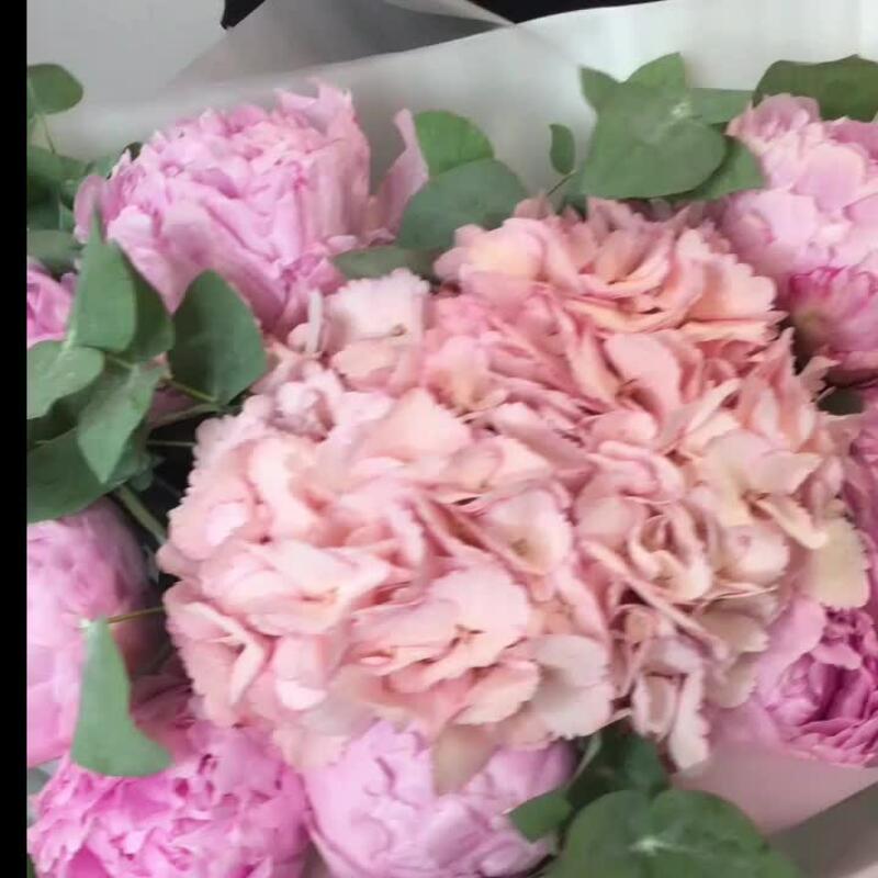 Гортензия – 1 шт.Эвкалипт – 4 шт.Лента атласная – 1 шт.Пленка матовая – 2 шт.Пион Голландия – 8 шт.