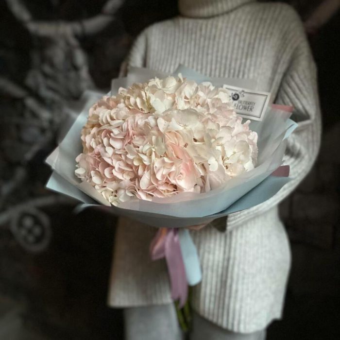 Красивый букет из 3 розовых гортензий в упаковке “Анже”